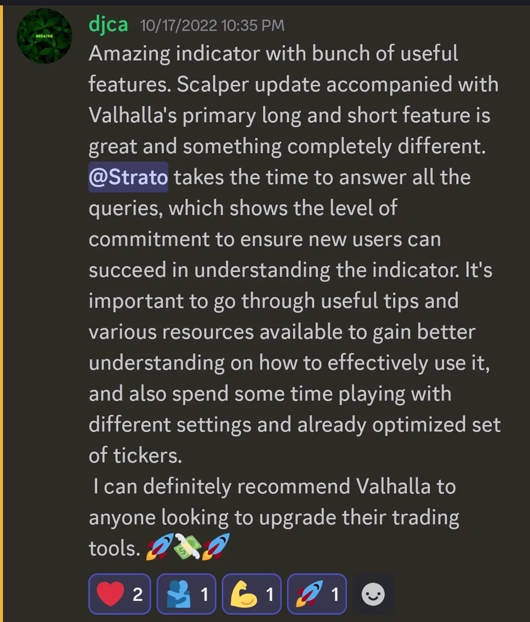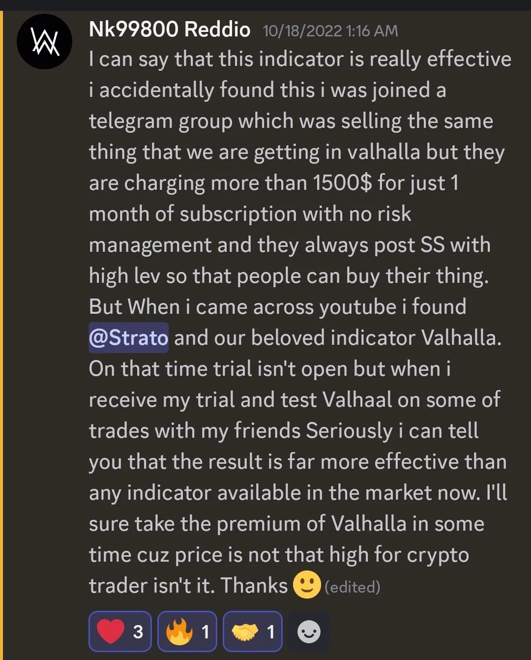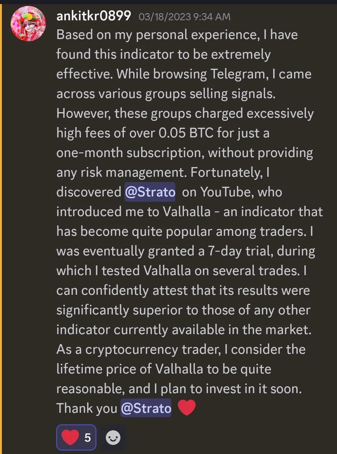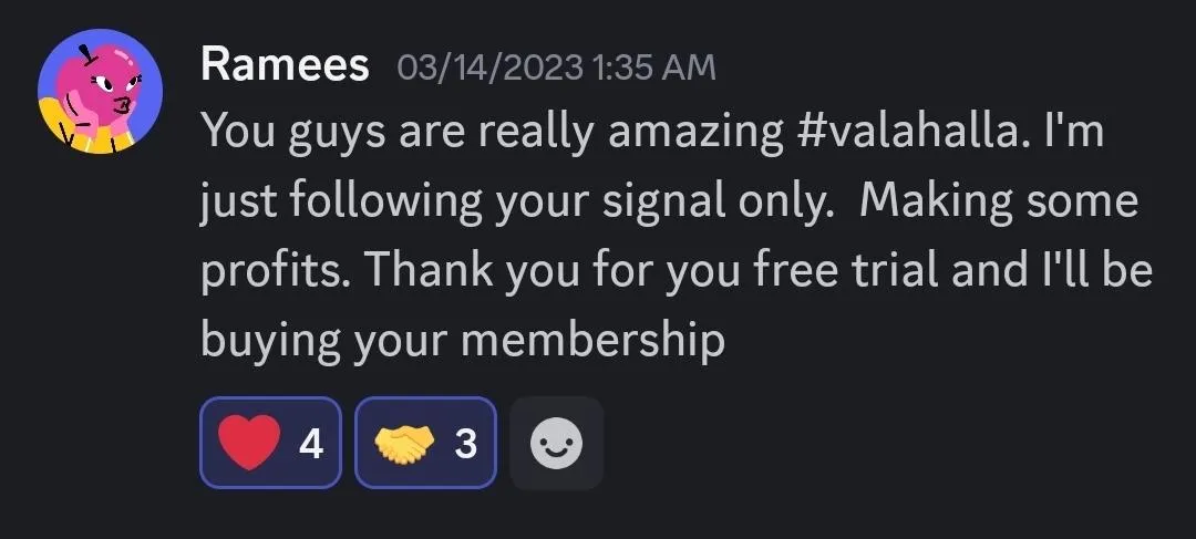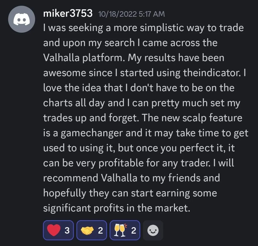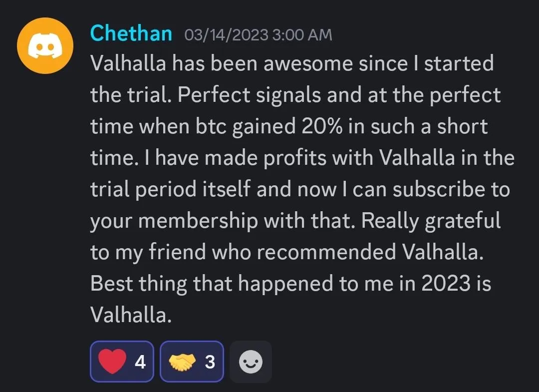 "Valhalla has been awesome since I started using it. Perfect signals and at the perfect time when btc gained 20% in such a short time."